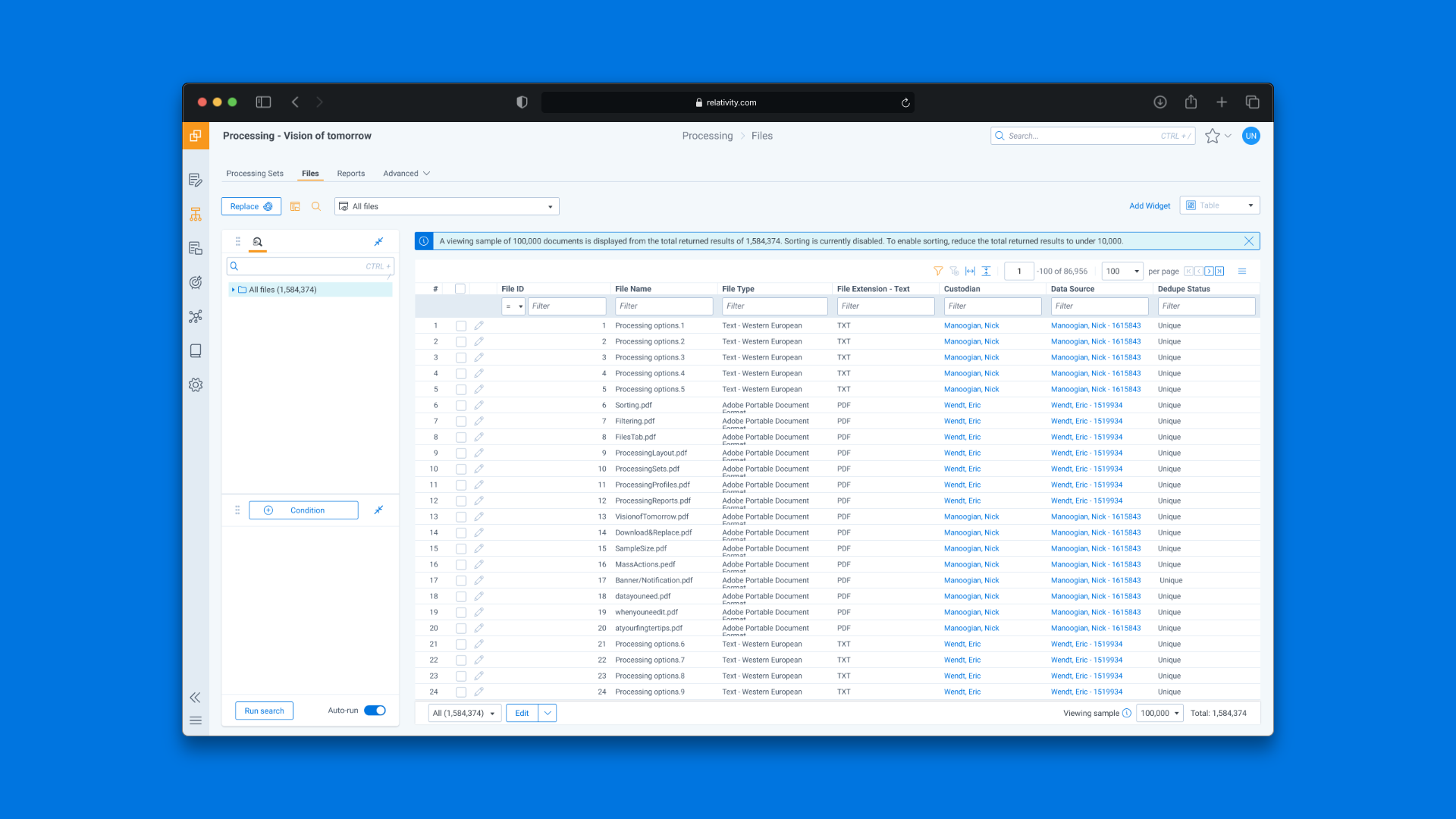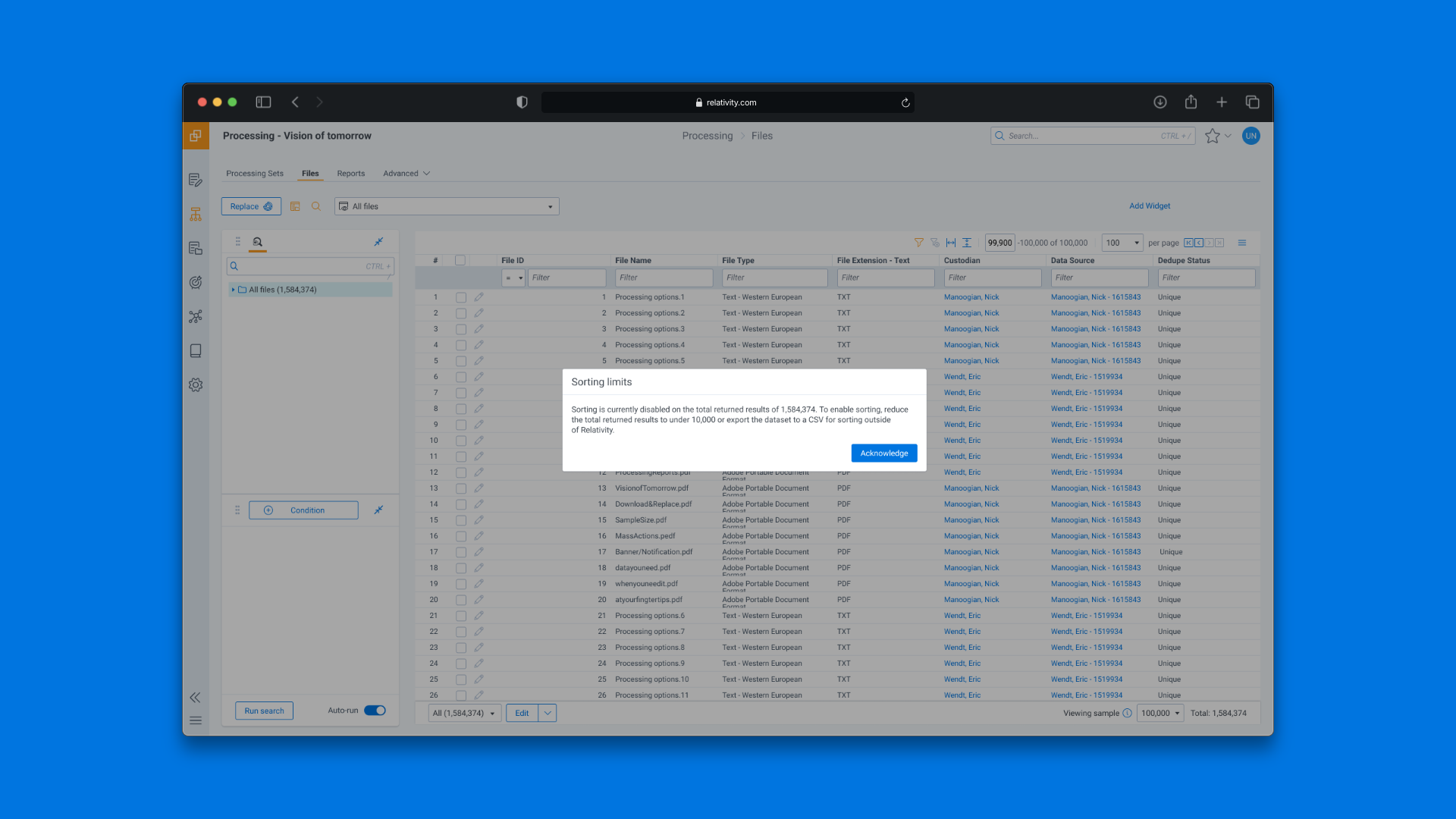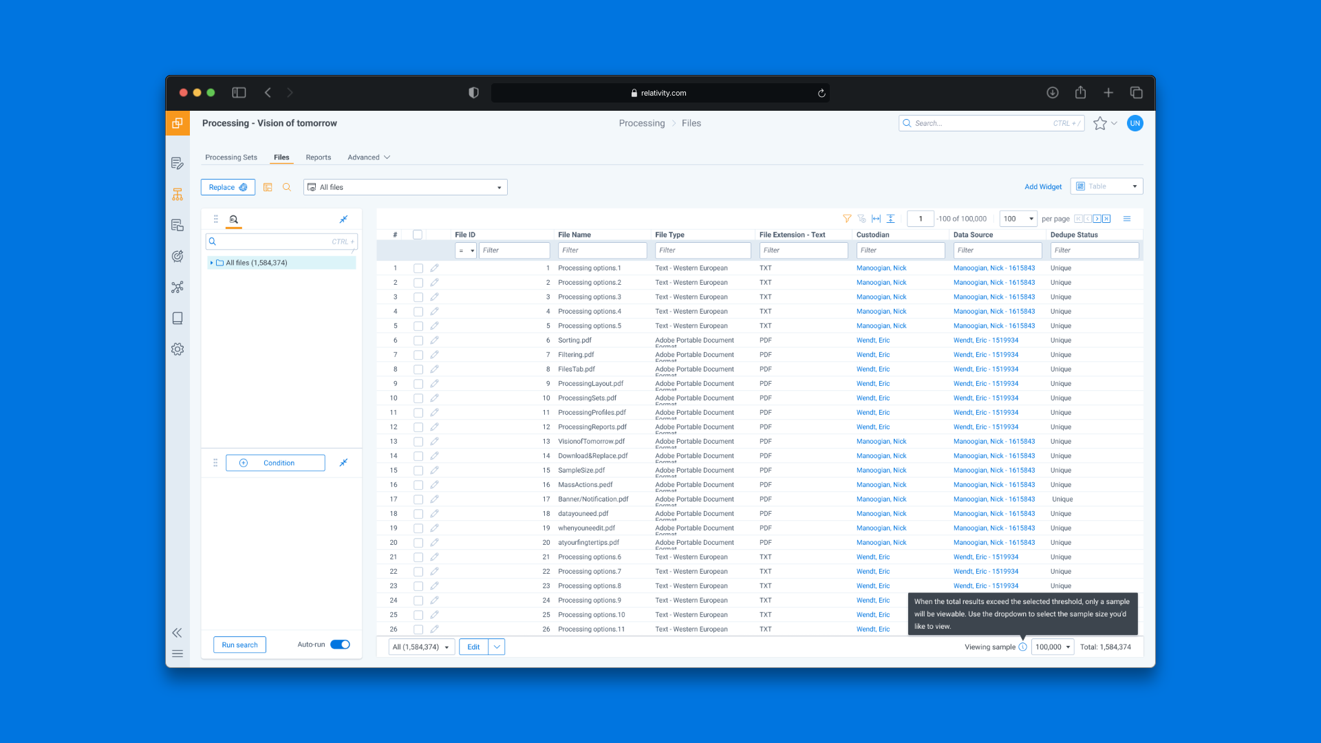 Configurable sampling. When results exceed the threshold, the list shows a sample — but widgets, mass actions, and total counts always reflect the full dataset. Users control the sample size from 10K to 100K.