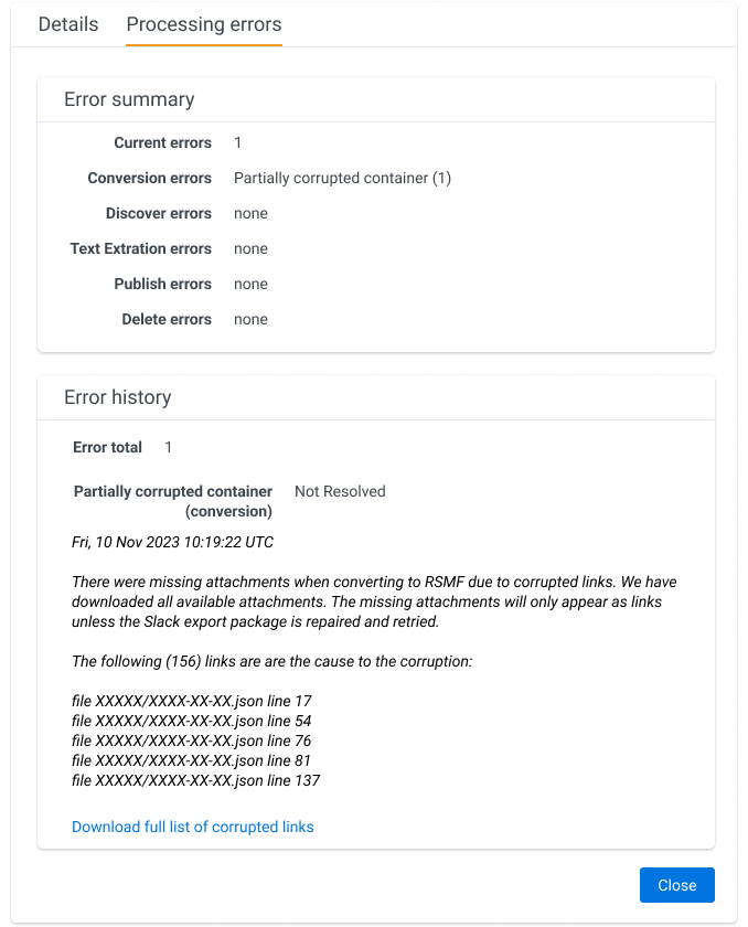 All RSMF conversions get a dedicated error panel that breaks down failures by processing stage, lists the specific affected files, and links to a downloadable full list. When Slack's API goes down mid-conversion, the dialog names the dependency, explains that attachments will convert as links instead, and confirms retries are automatic. Same principle everywhere: show what happened, give the specifics, let the user decide what to do next.