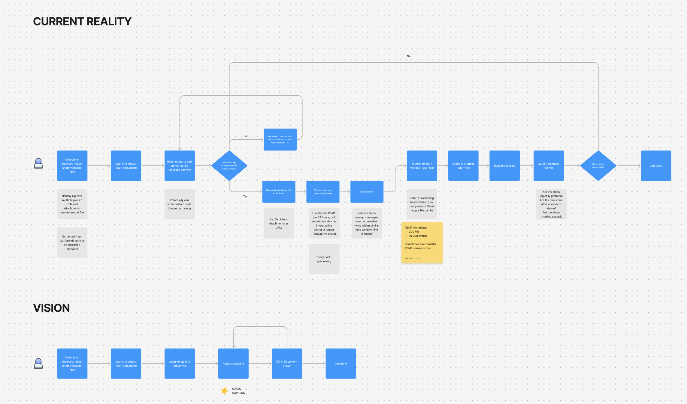 There was no integrated way to convert Slack, Teams, Google Chat, or Cellebrite exports into RSMF. If conversion failed, search couldn't index it, review couldn't code it, and production couldn't export it. Conversion sat at the top of the funnel, and every team downstream was waiting on it.