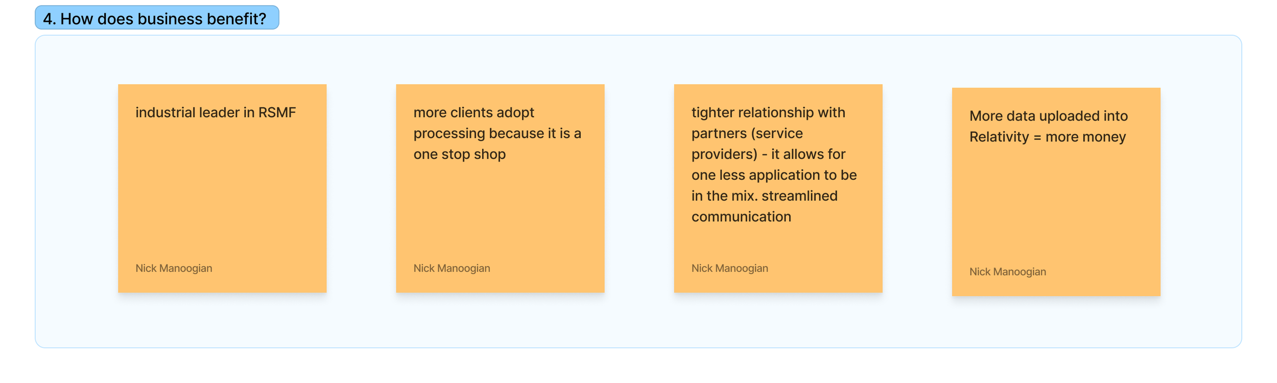 Before anyone started pushing pixels, I facilitated a product pitch workshop in FigJam to stress-test the direction. The "how does business benefit" exercise forced the team to articulate value beyond features: more data on platform means more cases where legal teams can discover the truth. More revenue means we fund more improvements to the product that makes that possible.
